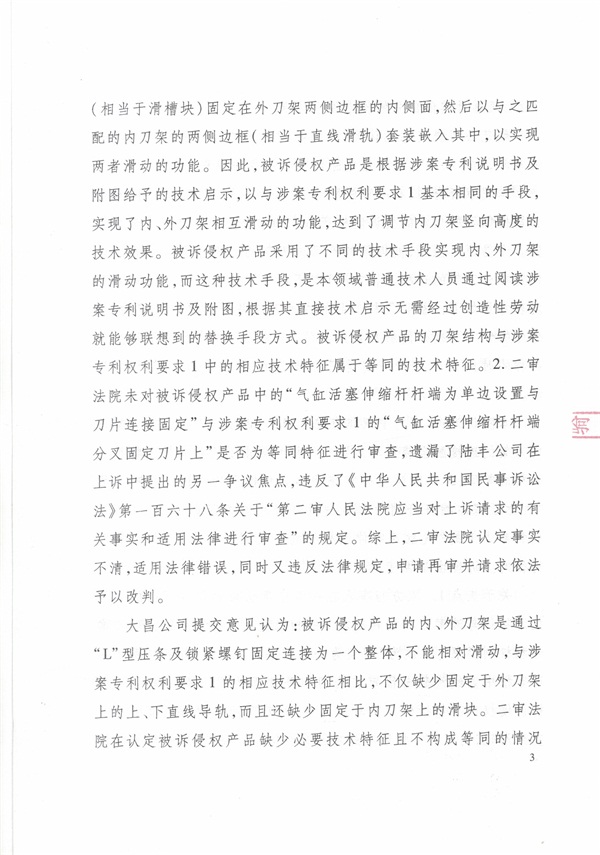 被告產(chǎn)品缺少涉案專利的必要技術(shù)特征,不構(gòu)成侵權(quán),被告泉州大昌紙品機(jī)械制造有限公司委托元?jiǎng)?chuàng)公司應(yīng)訴,歷經(jīng)三審獲勝訴。見最高人民法院〖2014〗民申字第1413裁決書。